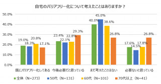 不動産関連の比較査定サイト「リビンマッチ」を運営するリビン・テクノロジーズ株式会社(本社:東京都中央区、代表取締役:川合 大無)は、「リビンマッチ」を利用した自宅を所有する50歳以上の男女全国273人を対象に「自宅のバリアフリー化」について調査しました。