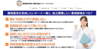 薬局売買業界の改革を目指すファーマバイセルは、業界最低水準の手数料により買い手側の薬剤師を経済面から支援するとともに、薬局運営の大きな助けとなるホームページ作成、サーバやドメイン管理費用を無償で提供します。一方の売り手側のオーナーは、案件紹介料も成約手数料も無料です。また、都外エリアに複数の拠点を持つため、地域の事情に応じた最適なM&Aを仲介します。さらに、フィナンシャルプランナーによる売却後の資産運用やライフプランなどのサポートも提供するWebサービスも加えて、2019年3月10日 よりリリースいたします。