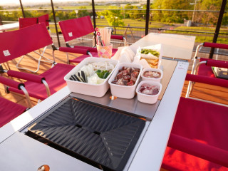 旭山に位置するハナサクカフェ屋上テラス席でBBQやたこ焼きを楽しめる事前予約制のプランです。屋上テラスからの旭川市街方面の眺望を楽しみながら、東旭川地域で親しまれている角切りジンギスカンやミックスホルモンを提供。Snowpeak社製のグリルテーブルに焼き肉プレートとバーナーをセット、旭山の心地よい風を感じながらアウトドア感あふれるお食事をご堪能いただけます。