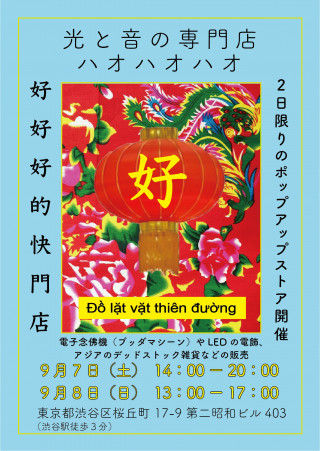 光と音の専門店 ハオハオハオは、2019年9月7日(土) 、8日(日)に東京都渋谷区で2日間限りのポップアップストアを開催する。