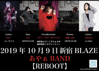 その熱を再びと、あやぁは当日のタイトルを「あやぁ生誕 逆襲のアヤァFES 2019〜俺は、此処の、王だ〜」と題し、"あやぁBAND"を再起動する。メンバーは、アヤァ=オブ=ザワールド(Vo&Gt/新世紀えぴっくすたぁネ申/秘密結社ニルヴァージュ∀)、masato(Gt/ex:SuG)、SAN(Gt/ex:ラッコ)、ルイ(Ba/ARTiCLEAR/ex:SCREW)、多時-taji-(Dr/ARTiCLEAR)の5名。ルイとmasatoは昨年に続いての参加。他のメンバーは今回が初となる。