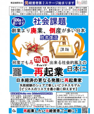 倒産を経験した元経営者の募集を開始します。創業支援は多くありますが、日本は再起業支援がなく再起にハードルがあります。様々な失敗経験をした仲間と共に新しいビジネスを継続的に創出し、何度でも挑戦が出来る日本を目指し、日本に再起業家を増やす事を目的とします。