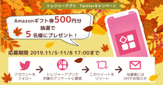 11月5日 から11月8日 17時までの間、トレジャーアプリとトレジャーアプリ公式ツイッターアカウントでプレゼントキャンペーンを開催いたします。「アプリ利用についてのアンケート」に期間中に回答していただいた方の中から抽選で5名様にAmazonギフト券500円分をプレゼントいたします。