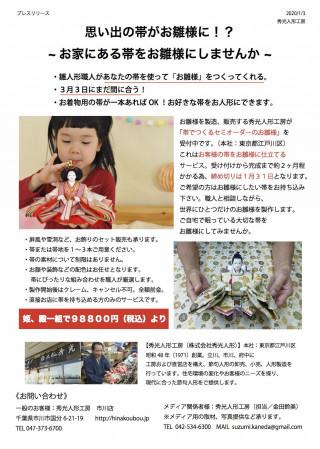 お雛様を製造、販売する秀光人形工房が「帯でつくるセミオーダーのお雛様」を受付中です。