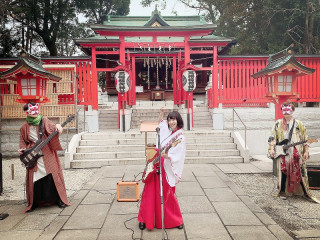続いては、Soul of Foxのメンバーたちによる境内の参道を演奏しながらの練り歩き。3人は宴を楽しむよう楽器を奏で笑顔で練り歩く。中でも、ふたたび巫女姿になって練り歩く福山沙織の楽しげな姿と表情には、ぜひ注目していただきたい。