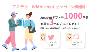 2月28日 から3月13日 19:00時までの間、アステク公式ツイッターアカウントでホワイトデーキャンペーンを開催いたします。フォロー&リツイートで抽選で3名様にAmazonギフト券1000円分をプレゼントいたします。