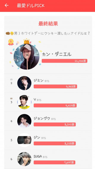カン・ダニエルの後に続けて、男性人気K-POPアイドルグループBTS(防弾少年団)のメンバーが上位5名に名を連ねた。2位ジミン(9,968票)、3位V(9,419票)、4位ジョングク(8,502票)、5位ジン(8,228票)。