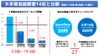 私たちは世の中の英語学習サービスの持つ無駄と不都合を極限まで削ぎ落とし、スピーキングの学習効率を時間面で ”3.5倍” 、コスト面で ”27分の1” に縮めた「SpeakNow」を開発しました。
