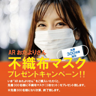 キャンペーン内容は“動くプリントシール!ARおたよりさん”をご購入いただくと、先着300名様限定で不織布マスク(3枚セット)をプレゼント致します。