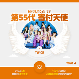 TWICEは、一か月間の累積順位が1位となり、22ヶ月連続寄付天使に選ばれた。TWICEは今まで寄付天使に22回、寄付妖精に13回と合計35回の寄付を行った。寄付総額は1750万ウォン(4月16日 午前4:20 UTC:1540285.53円)である。