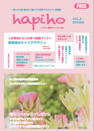 保育園・幼稚園の人材コンサルティング事業を行う有限会社たっちかんぱにぃ(福岡市東区 代表取締役立川優子)は福岡県内ほぼ全ての保育園・幼稚園2100園に直接届くフリーペーパー「hapiho」の第3号(春号)を4月20日 発刊した。