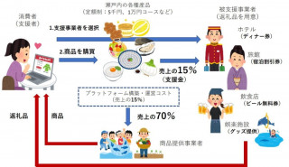 「せとうちショッピングエール」は、消費者の皆様が、返礼品のおまけつきでお得に瀬戸内を応援できる通販サイトです。消費者の皆様にサイト上で商品を購入いただき、その売り上げの一部を集客に苦しむ宿泊事業者や飲食事業者、観光施設の運営事業者など観光関連事業者(以下、被支援事業者といいます)の皆様に支援金としてお渡しすることを予定しており、一方で支援を受ける事業者の皆様からは、消費者に対しそのお礼としてコロナ終息後に利用可能な割引券や無料券等を発行していただきます。