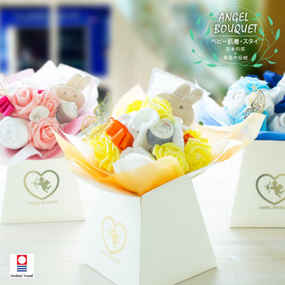 モノづくり日本が誇るブランド『今治タオル』のメーカー、株式会社ハートウェルの高級ベビースタイと、生地から縫製まで一貫して日本製にこだわった老舗ベビー肌着メーカー、株式会社川端縫製の極上のベビー服、愛媛県伊予市の木遊舎で職人が手作りした歯固め・ガラガラを、英国スタイルの手作りブーケに作り上げたものが『ANGEL BOUQUET・エンジェルブーケ』です。 天使が舞い降りる空間をイメージして『ANGEL BOUQUET・エンジェルブーケ』と名付けました。 大切な赤ちゃんのためにセレクトしたベビー用品を、真心こめて一点一点ていねいにお花にしてブーケに仕上げました。