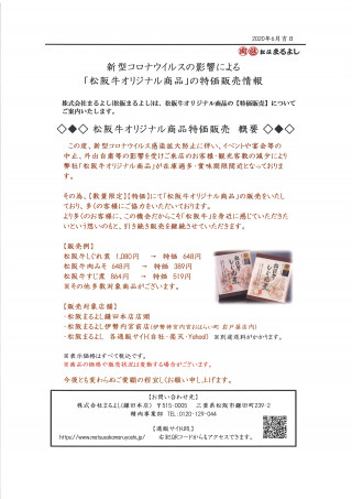 この度、新型コロナウイルス感染拡大防止に伴い、イベントや宴会等の中止、外出自粛等の影響を受けご来店のお客様・観光客数の減少により弊社「松阪牛オリジナル商品」が在庫過多・賞味期限間近となっております。