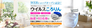 ウイルスころりん10リットル、20リットルどちらかご購入の方の中から、不織布三層構造マスク50枚入り1箱を、抽選で60名様にプレゼント!
