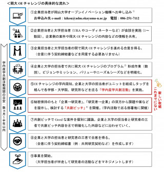 2)プログラム名は、「○企業名○-岡山大学オープンイノベーションチャレンジ」(Open Innovation Challenge for Okayama University & ○企業英名○ Co., Ltd.)となる予定です。なお、プログラムを水面下(世間に対して非公表)で動かしたいという企業側の意向がある場合、実施期間中はそのように取り扱います。