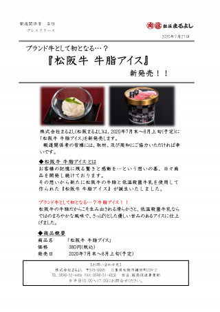 株式会社まるよし(松阪まるよし)は、2020年7月 末~8月上旬(予定)に「松阪牛 牛脂アイス」を新発売します。