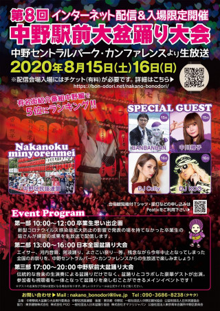 また昨年の開催では、DJ KOO、高橋洋子らをゲストに招き、テレビ番組「アド街ック天国」中野ランキングで第5位になる等、複数社のメディアにも取り上げられ、約 20,000名と過去最⼤の来場者数を記録しました。盆踊りの伝統や型は継承しながら、様々な新しい取組にも挑戦する「伝統と⾰新が融合した」盆踊り⼤会で、⽼若男⼥皆さまにご参加いただいています。今回は新型コロナウイルスの影響を受け、オンライン+一部リアルイベントとして、豪華ゲスト陣も更にパワーアップして開催いたします。