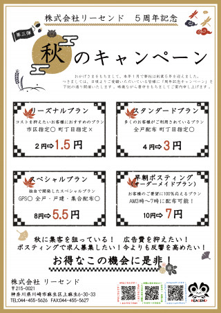 株式会社リーセンドでは創業5周年記念秋のキャンペーンを9月30日 までにご発注頂いたお客様限定で開催いたします!