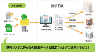 『請求DX』は、テレワークの弊害である紙業務の一つ、請求書を作成、送付までの業務を自動化します。お客様は、取引先の情報(送付先メールアドレスなど)をExcelでメンテナンスし、伝票データを用意するだけで運用可能です。他社の従量制請求電子化サービスと異なり、請求件数に関係のない月額定額制が特長です。