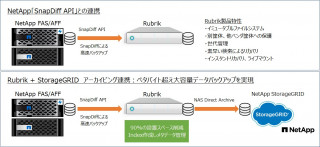 このRubrikをNetAppストレージソリューションのバックアップシステムとして連携することで、NetApp データファブリックに高水準のデータ制御とデータ可視性をもたらし、高度なデータ世代管理や素早いデータ検索が可能となり、有事の際の復旧作業も迅速化されます。また、バックアップで時間を要するファイルスキャンを大幅に短縮可能となり、大容量データでも高速バックアップできます。さらに、二次保管先として安価で拡張性の高いオブジェクトストレージ「NetApp StorageGRID」をアーカイブ先に接続すれば、ペタバイト超の大容量バックアップデータをコスト効率良く収容できます。