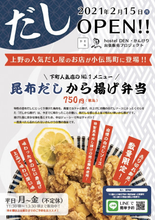 昭和下町だし酒場「かんけり」(所在地:東京都台東区 代表者:高松健 以下かんけり)は、2021年2月8日 より、hostel DENを経営する株式会社藤井不動産(本社:東京都中央区 代表者:藤井広之 以下DEN)と飲食事業で協業致します。