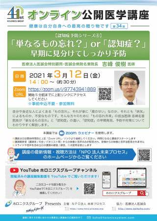 【内容】自分や身近な人によくある「もの忘れ」、それが単に「歳のせい」なのか、それとも「病気」によるものか、不安なものです。そんな方々のために「もの忘れ外来」の担当医師 吉峰名誉院長が「単なるもの忘れ」と「認知症」の違い、「認知症」の早期発見、予防や対策についてわかりやすく解説します。