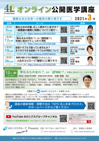 オンライン公開医学講座は多職種からのテーマで構成されており、医療法人医誠会を含むホロニクスグループ病院・施設で活躍中の医師や看護師等、現役の医療従事者が毎週1回講師を担当します。