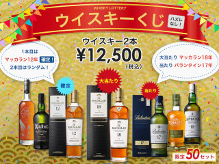今回のウイスキーくじは 2本1セットとなっており シングルモルトのロールスロイスと呼ばれるスコッチの王道「マッカラン12年」は確定、もう一本は 大当たりに入手の難しい「マッカラン18年」をはじめ 「バランタイン17年」、プレミアムバーボンの「イーグルレア10年」や通好みの「アードベック10年」などを含む幅広いラインナップとなっている。