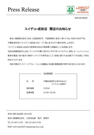 長谷川産業株式会社(本店:北海道帯広市 代表取締役:長谷川 貫一)では、令和3年6月下旬、千葉県成田市に「スイデコ・成田店」をオープン致しますのでご案内を申し上げます。