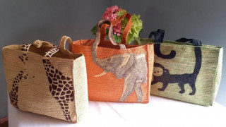ゾウ・キリン・サルの柄がきれいにできるまでに、現地の女性たちは時間をかけてしっかり刺繍しています。ゾウの色に合わせて、様々な色で染められたラフィアの糸が使われています。