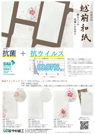 ウイルスの感染が猛威を振るう現在、感染対策の徹底により、身の回りの安心・安全化、今まで以上に「抗菌・抗ウイルス」の製品が多く求められ、抗菌仕様の製品の需要が高まっております。株式会社今村紙工では、2020年10月 に販売を開始致しました「抗菌OPP使い捨てマスクケース」に次ぐ抗菌加工仕様の製品と致しまして、封筒に対し抗菌加工を施し(SIAA取得済)、お金を包む中包みには抗菌・抗ウイルス効果のある高機能性を持たせた「銀雪」を使用した「抗菌祝儀封筒」 を販売致します。