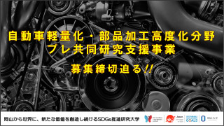 国立大学法人岡山大学(本部:岡山市北区、学長:槇野博史)では、自動車要素技術(軽量化・部品加工高度化等)分野について、技術等の高度化の推進を図り、地域産業の活性化に寄与するため、共同研究の検討を支援する「自動車要素技術(軽量化・部品加工高度化等)分野プレ共同研究」支援事業を開始します。