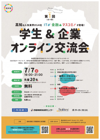 この度、高知県主催の「第1回学生&企業オンライン交流会~高知県の人気業界(IT・金融・マスコミ)から4社が登場!~」を7月7日(水) に開催いたします!