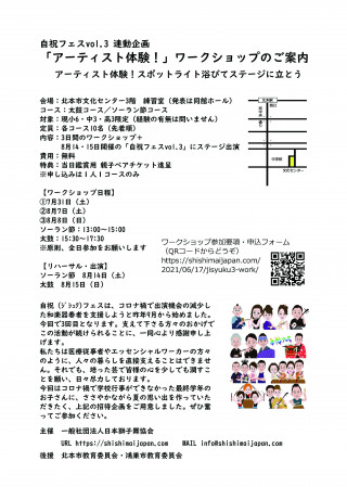 内容:3日間のワークショップ+8月14・15日開催の「自祝フェスvol.3」内でステージ発表