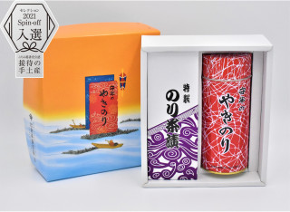 こちらの商品は、当店最上級の板のりを独自の9切にしたものを茶筒缶に詰めたやきのりとそのやきのりの裁ち落としをふんだんに詰め込んだ、香り高くとろける逸品の特製海苔茶漬がセットになった商品です。