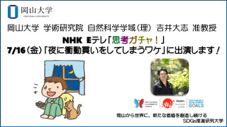 国立大学法人岡山大学(本部:岡山市北区、学長:槇野博史)の学術研究院自然科学学域(理)の吉井大志准教授がNHKのEテレで放送している「思考ガチャ!」の7月16日(金) 「夜に衝動買いをしてしまうワケ」(放送時間22:00~22:30)に時間生物学の専門家として出演します。