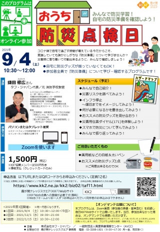 今年度の新企画として、元消防学校教官の鎌田修広さんを講師にお迎えし、2021年9月4日(土) に「【オンライン】第1回おうち防災点検日~みんなで防災学習! 自宅の防災準備を確認しよう!~」を開催いたします。