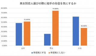 男女別でみると、女性の60%が相手の年収を気にする一方で、男性は25%となっており、女性の方が相手の年収を気にする傾向にあります。