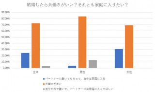 基本的に女性の方は家庭に入りたいと思っている方は意外と多く、共働きを選択した方の中にも「生活に余裕が無いから仕方なく」ということで共働きを選択している方が多く、男性側に一定の稼ぎがあり、将来の安定が見えていれば共働きではなく家庭に入りたいと思っている人はかなり多そうであると言えます。
