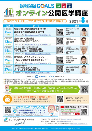 オンライン公開医学講座は多職種からのテーマで構成されており、医療法人医誠会を含むホロニクスグループ病院・施設で活躍中の医師や看護師等、現役の医療従事者が毎週1回講師を担当します。