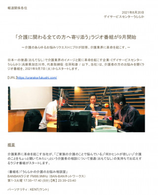 日本一の接遇(おもてなし)で介護業界のイメージと質に革命を起こす企業・《デイサービスセンターうららか》(兵庫県加古川市、代表取締役:住所和彦 / 以下、当社)は、介護者の方のお悩みを聞くラジオ番組を、2021年9月7日(火) からスタートします。