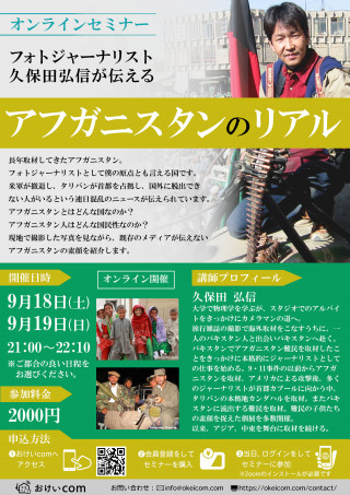 フォトジャーナリストの久保田弘信氏の『アフガニスタンのリアル』が9月18日(土) の21:00~22:10にオンライン習い事サイト「おけいcom」で開催されます。