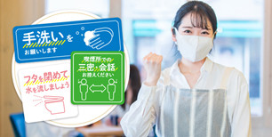 感染防止対策を呼び掛ける「手洗い」「消毒」「ソーシャルディスタンス」や「マスク会食」など、さまざまなシーンで使える店内掲示物ステッカーの販売を開始しました。