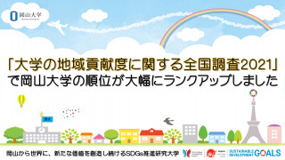 この調査は、「大学の組織、制度」、「学生、住民」、「企業、行政」、「働く場としての大学」、「SDGs・コロナ対応」の5分野の回答が点数化され、岡山大学は前回調査(2019年度)から17位ランクアップ(前回31位→14位)し、大幅に順位を上げました。