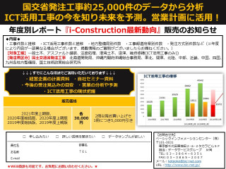 この度、建設業界に特化したマーケティングで35年の実績を持つベーシックインフォメーションセンター株式会社(本社:東京都千代田区 代表取締役:伊藤敏郎)は、土木関連事業者向けに、「ICT活用工事最新動向レポート」の販売を開始しました。 既にICT活用工事の件数や傾向を半期毎のレポートとしてお得意様向けに発行しており、業界各社様にご活用いただき高い評価を得てます。 半期毎のレポートとなっているので、数値の推移と共に現在進行の状況を踏まえた内容になっています。