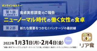 2022年1月 度は、 夕食 カテゴリーにおける食卓の変動を “ニューノーマル時代の働く女性の食卓” と題したご報告と、“新たな需要をつかむ!パッケージの最前線” をご紹介する、二本立てのセミナーです。