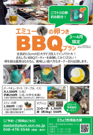 埼玉県新座市に無料で だちょう と触れ合える稀有な牧場があ ります 。それが「だちょう牧場並木屋」(代表:並木大治 。 この度、 3月 1日 より新サービス「エミューの卵付きバーベキュープラン」をスタートしました。