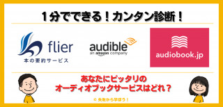 オーディオブック大手「Amazon Audible(オーディブル)」と「audiobook.jp」に加え、本の要約を1冊10分で聴ける「フライヤー」の3つから、あなたにピッタリのオーディオブックサービスを診断できます。
