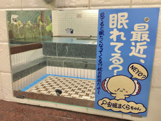銭湯で安眠まくらちゃんを見た人々の“安眠効果”が期待される。